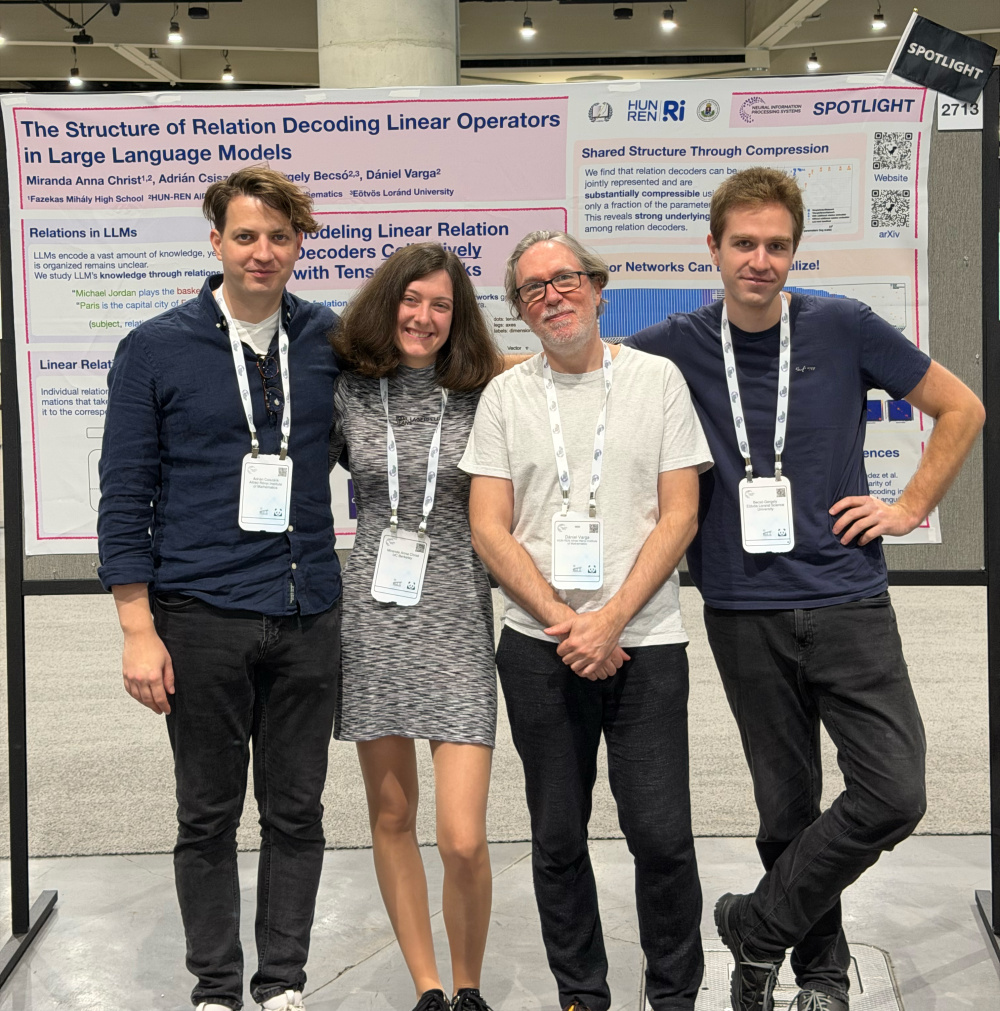 A világ legrangosabb mesterséges intelligencia konferenciájára, a NeurIPS 2025-re, a Spotlight programba hívták meg a Rényi Intézet kutató csapatát, Christ Miranda Annát, Csiszárik Adriánt, Becsó Gergelyt, és Varga Dánielt. Bemutatott cikkük, amelynek címe "The Structure of Relation Decoding Linear Operators in Large Language Models", érdemi előrelépést jelent a nagy nyelvi modellek működésének megértésében.